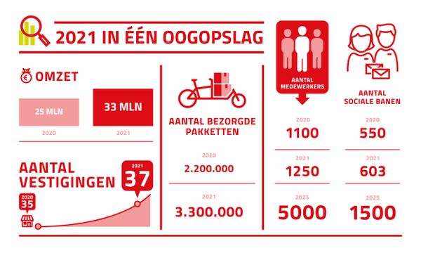 “Met trots. In 2020 stuurden bedrijven meer pakketjes naar thuiswerkers dan tijdens de lockdown in 2021. Toch groeiden we. We fietsen in meer steden, draaien meer omzet en kregen meer collega’s. Deze groei laat zien dat we de wereld weer een beetje mooier maakten. Meer impact maken. Met die blik kijk ik naar deze cijfers.”