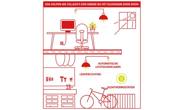 Een prettige werkplek en bewust omgaan met energie gaan prima samen! Op de vestigingen hebben we bijvoorbeeld automatische lichtschakelaars. En we gebruiken enkel hernieuwbare energiebronnen als groene stroom en -gas. Onze nieuwe panden worden gelijk voorzien van LED-verlichting, in bestaande panden wordt dit gefaseerd ingevoerd.